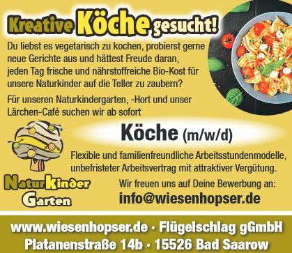 Derzeit sind wir auf der Suche nach kulinarischer Verstärkung, damit unsere Naturkinder auch in Zukunft jeden Tag frische und vegetarische Gerichte genießen können.